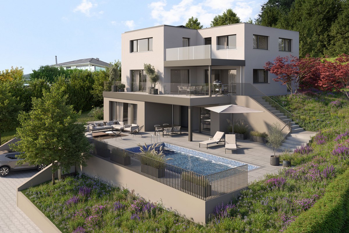 Das 7½‑Zimmer‑Haus vereint verspielte Kubusarchitektur mit gelebter Alltagstauglichkeit. Das talseits freiliegende Untergeschoss nimmt diskret den Kellereingang, die drei Garagenplätze sowie Technik und Stauraum auf. Eine Ebene höher heisst das Mezzaningeschoss die Gäste mit einem klar gestalteten Eingang und einer aufgeräumten Garderobe willkommen; der Elternbereich und das Studio – beide mit eigenem Bad – bieten Ruhe und Rückzug, bevor sich die grosszügige Gartenterrasse mit Pool als sommerliches Wohnzimmer öffnet. Im Erdgeschoss gehen Wohnen, Essen und Kochen übers Eck nahtlos ineinander über: Die Kochinsel wird zum sozialen Mittelpunkt, der Vorratsraum sorgt für Ordnung im Hintergrund. Ein Büro und das Gäste‑WC ergänzen unaufdringlich den Alltag. Im Obergeschoss gehört die Bühne den Kindern – drei helle Zimmer, ein Bad, ein separates WC und ein Balkon schaffen einen freundlichen, gut zonierten Bereich mit Blick ins Grüne.